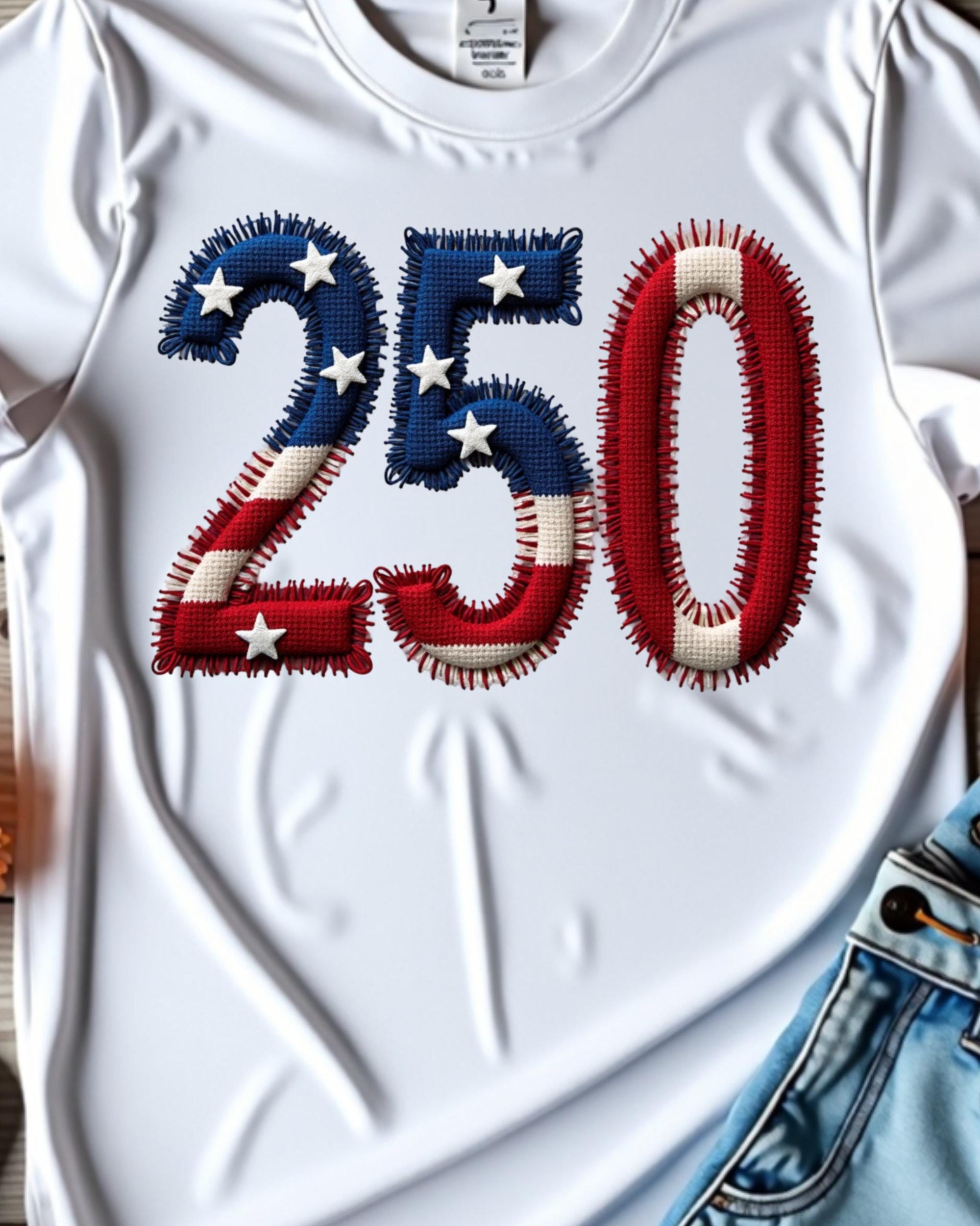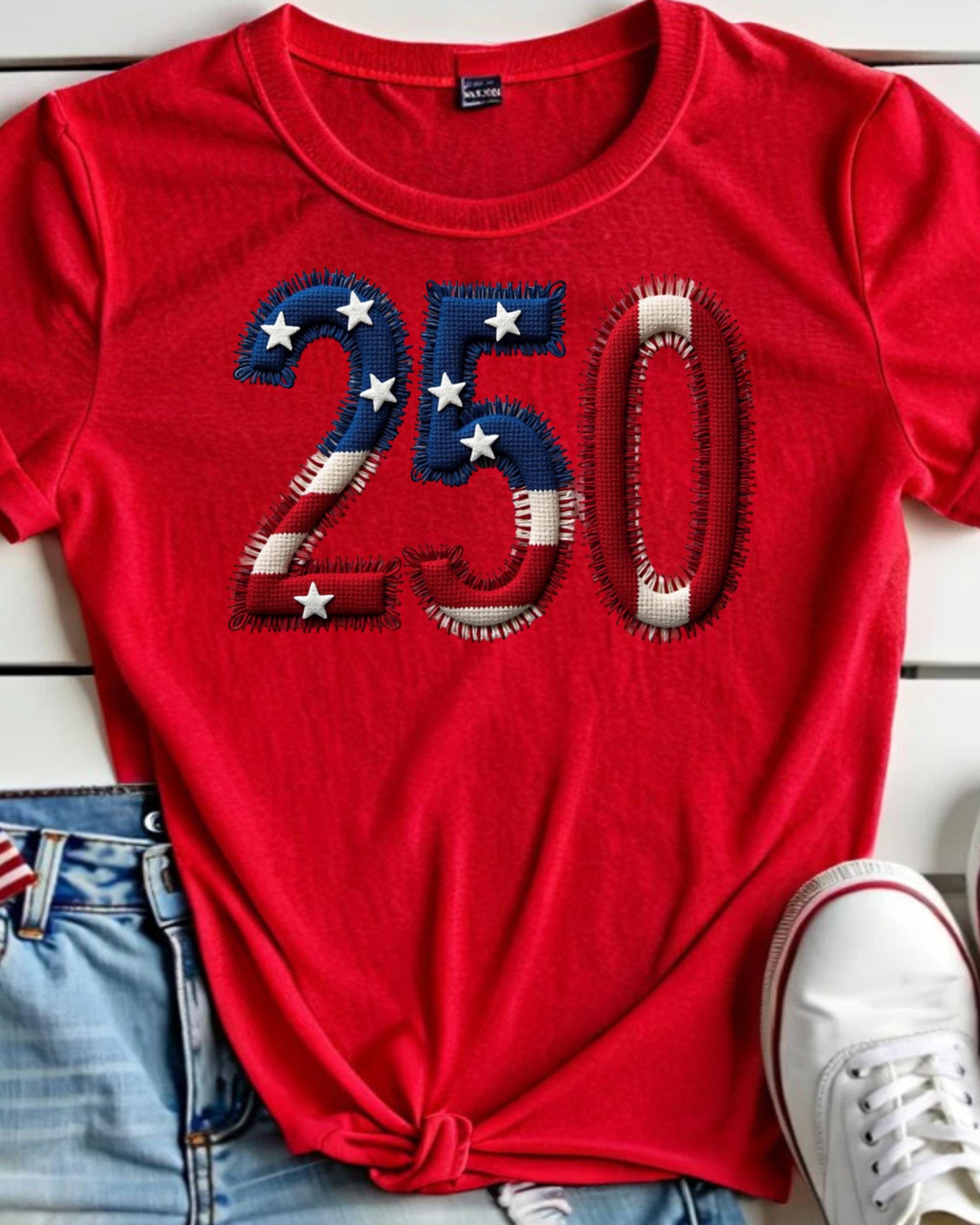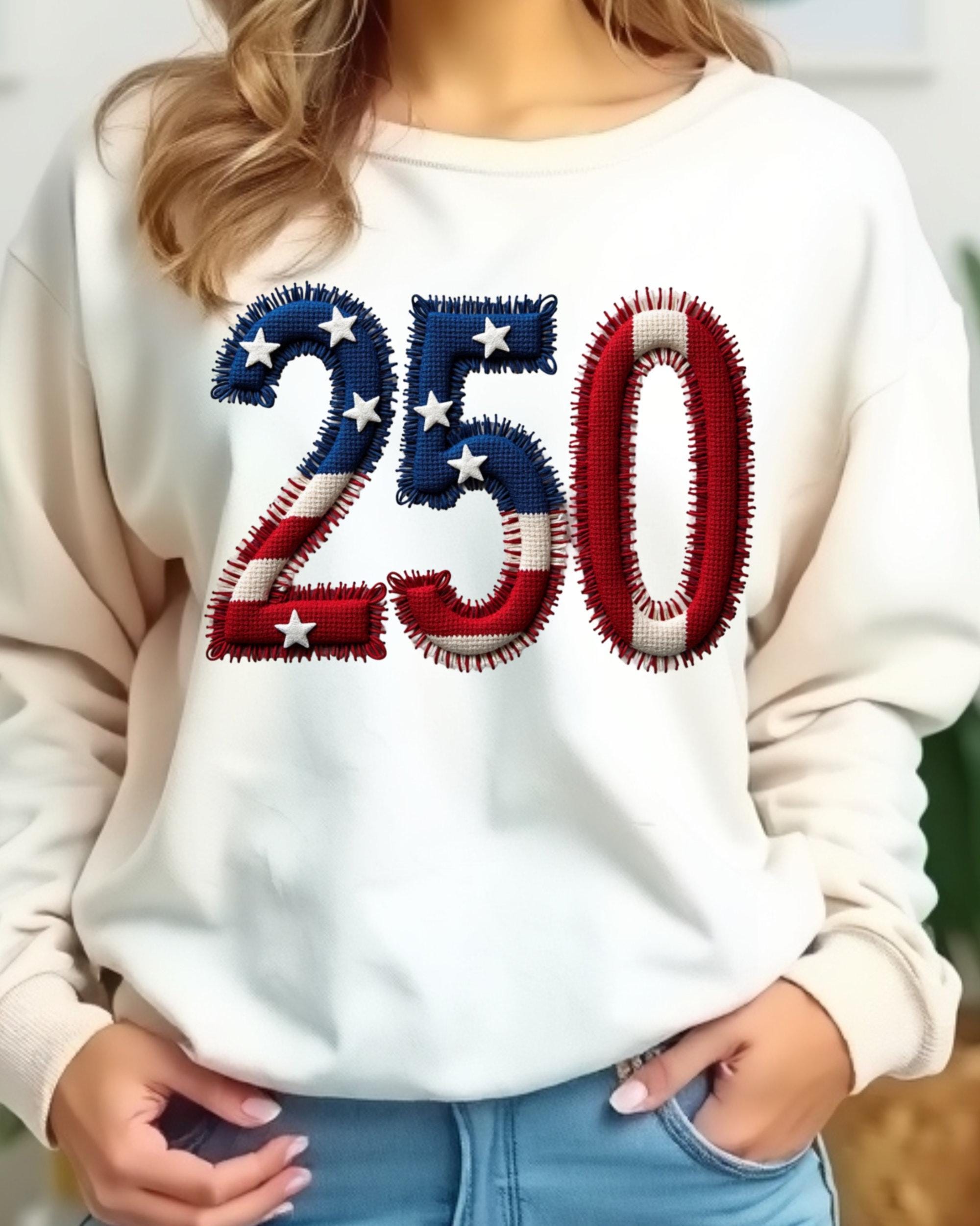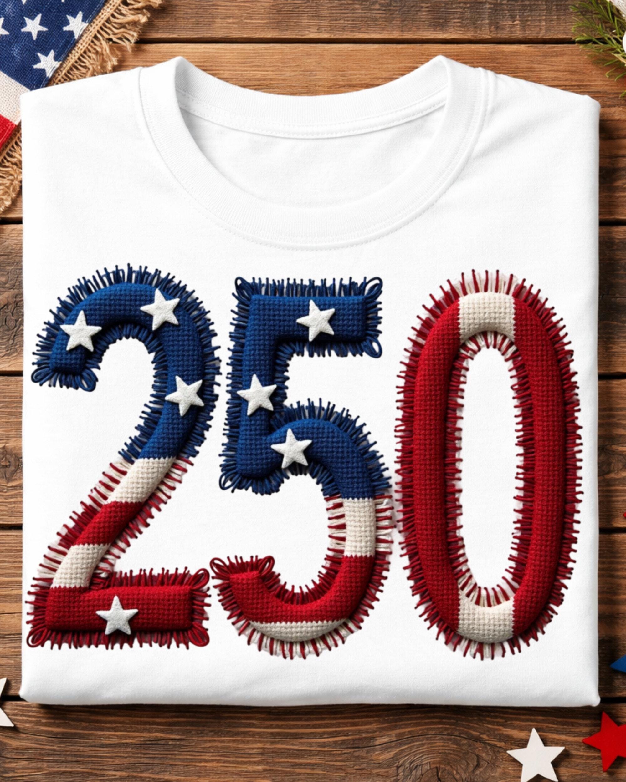 Celebrate America’s 250th anniversary with this USA 250 PNG featuring a faux embroidery patriotic design. This America 250 PNG is perfect for 4th of July shirts, sweatshirts, tumblers, mugs, tote bags, and sublimation projects. A great digital design for patriotic crafts, Independence Day apparel, and festive USA-themed creations.